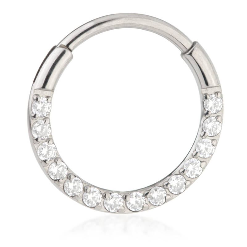 - Titanium clicker with baguette style paved edge can be used for daith and septum piercings. Aswell as lobe